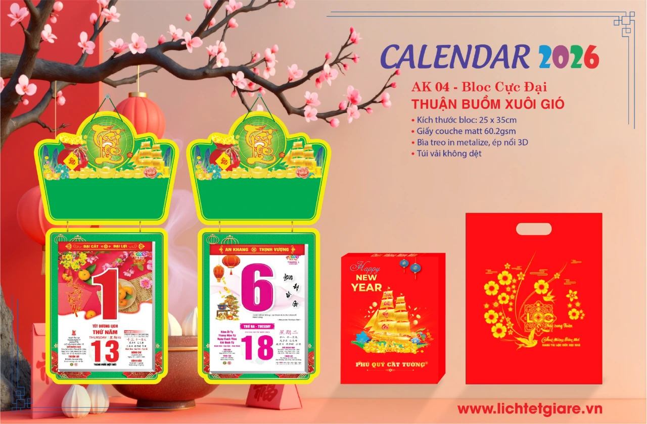 Mẫu lịch bloc treo tường 2026 chủ đề Thuận Buồm Xuôi Gió phối xanh lá mang ý nghĩa hanh thông – vượng lộc. Bìa metalize óng ánh kết hợp gia công cao cấp, phụ kiện mạ vàng tinh xảo; phù hợp làm quà Tết doanh nghiệp hoặc trưng bày tại gia/VP. Hỗ trợ in lịch Tết theo yêu cầu và in độc quyền theo nhận diện thương hiệu.