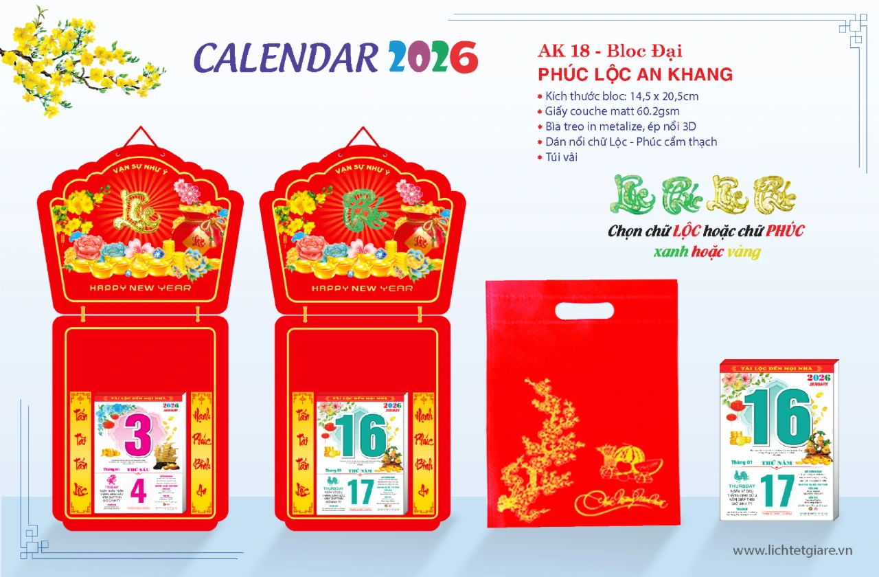 Mẫu lịch bloc treo tường 2026 chủ đề Phúc Lộc An Khang gửi gắm lời chúc bình an – tài lộc – thịnh vượng. Bìa metalize óng ánh kết hợp hoàn thiện tinh xảo và phụ kiện mạ vàng tạo tổng thể sang trọng, phù hợp làm quà Tết doanh nghiệp hoặc trưng bày tại nhà/văn phòng. Hỗ trợ in lịch Tết theo yêu cầu và in độc quyền theo nhận diện thương hiệu.