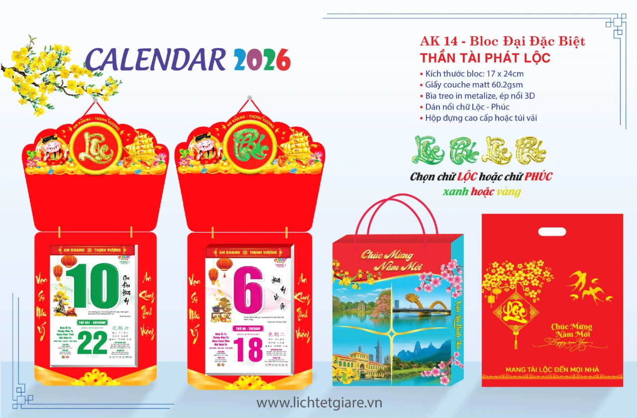 Mẫu lịch bloc treo tường 2026 chủ đề Tấn Tài Phát Lộc gửi gắm lời chúc tài lộc – thịnh vượng. Bìa metalize óng ánh kết hợp kỹ thuật hoàn thiện tinh xảo và phụ kiện mạ vàng tạo tổng thể sang trọng, phù hợp làm quà Tết doanh nghiệp hoặc trưng bày tại nhà/văn phòng. Hỗ trợ in lịch Tết theo yêu cầu và in độc quyền theo nhận diện thương hiệu.