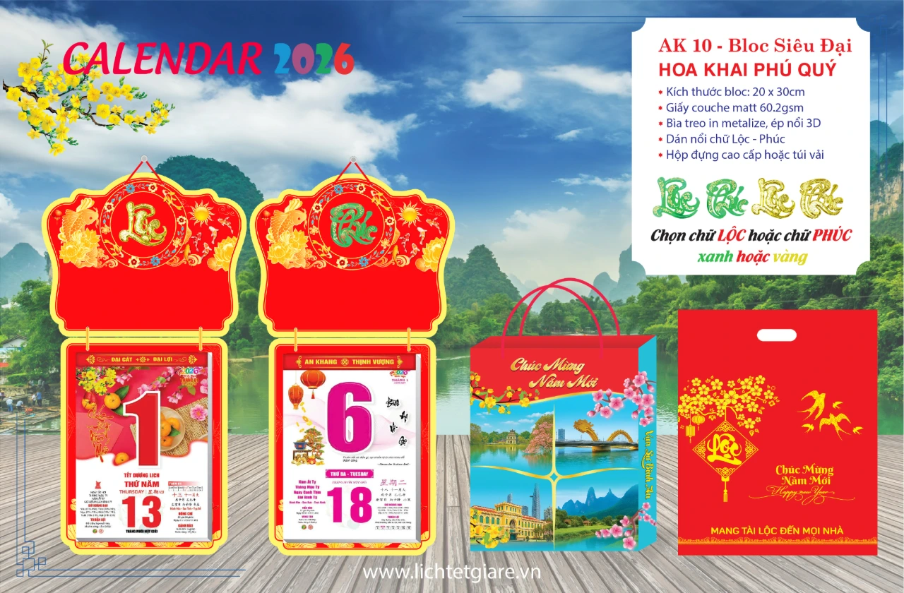 Mẫu lịch bloc treo tường 2026 chủ đề Hoa Khai Phú Quý gợi sắc xuân nở rộ – biểu trưng tài lộc, thịnh vượng. Bìa metalize óng ánh kết hợp kỹ thuật hoàn thiện tinh xảo và phụ kiện mạ vàng, phù hợp làm quà Tết doanh nghiệp hoặc trưng bày tại nhà/văn phòng. Hỗ trợ in lịch Tết theo yêu cầu và in độc quyền theo nhận diện thương hiệu.
